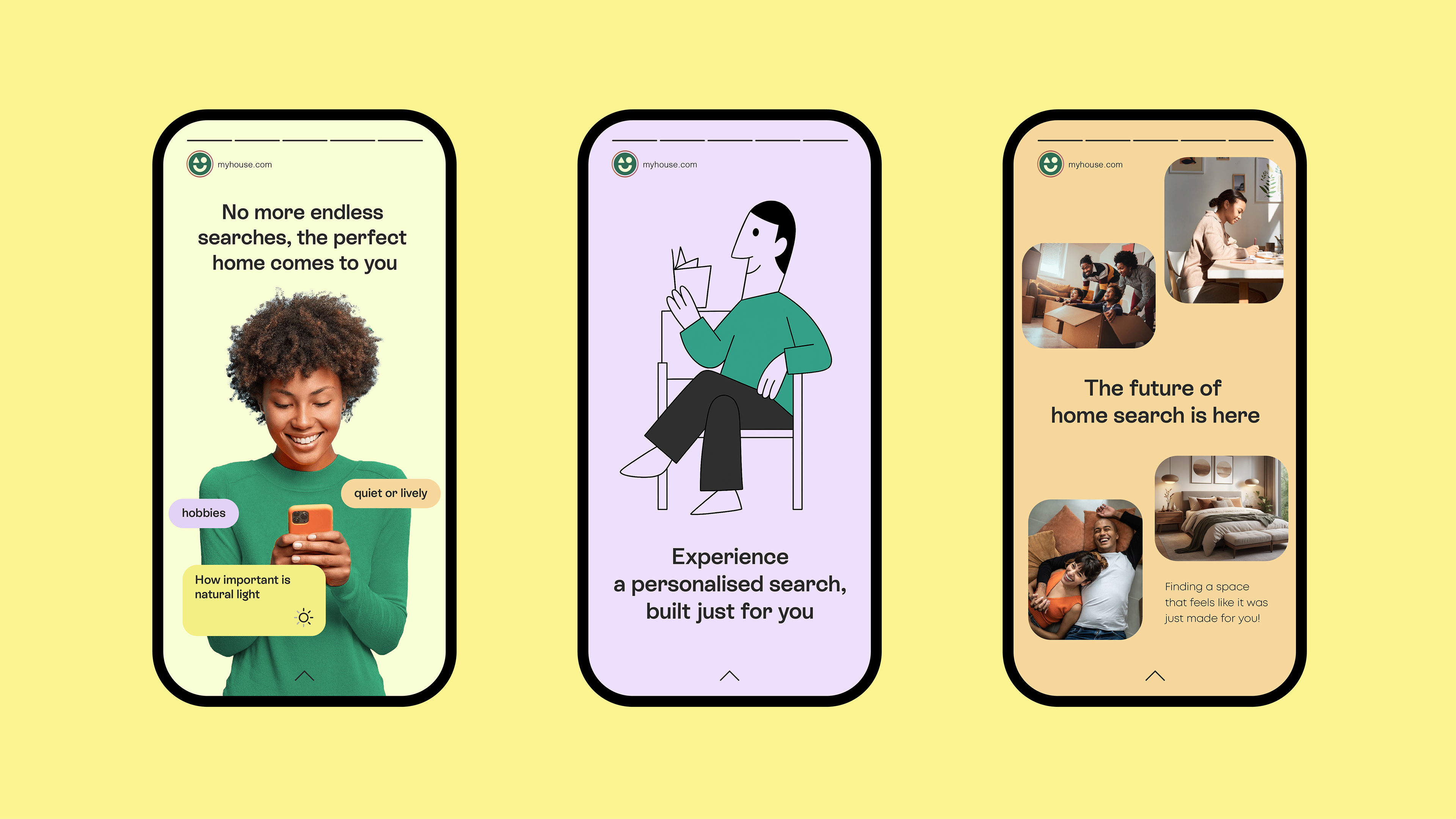 The logo blends a friendly face icon—abstracted from a home window inside an app-like tile—with a geometric wordmark softened by a handwritten “y,” suggesting personal ownership. The wider system uses rounded shapes, conversational prompts, and bold mobile-first layouts, creating an experience where searching for a home feels guided, personal, and human.